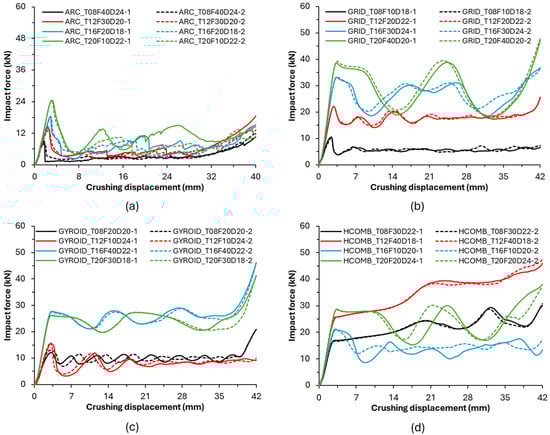 Impact force–crushing displacement curves of bamboo-inspired circular tubes. (a) Archimedean chords infill pattern. (b) Grid-type infill pattern. (c) Gyroid-type infill pattern. (d) Honeycomb-type infill pattern.
