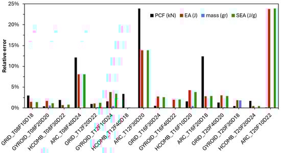 The repeatability of the experimental results is also evaluated using the relative error graph presented in Figure 7. The graph shows that the relative errors for the peak force (PCF), energy absorption (EA), mass, and specific energy absorption (SEA) parameters are acceptable and low, except for the Archimedes pattern type. This supports the reliability of our experimental methodology and results.