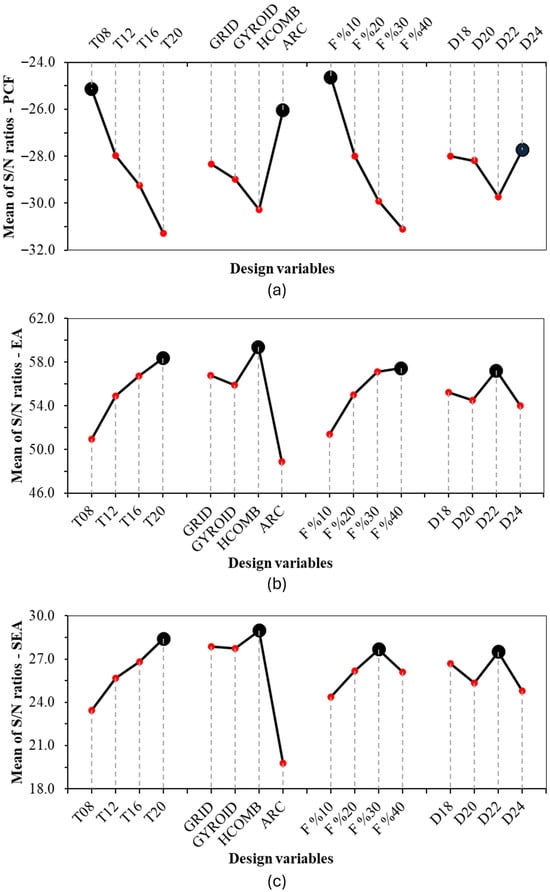 In the previous section, comments are made on deformation modes and impact force–crushing displacement curves. In this study, since four different parameters, namely infill pattern, infill ratio, wall thickness, and inner diameter, are examined and the designs are made according to the Taguchi method, the effects of these parameters can be revealed more clearly with the Taguchi method. In this section, the effects of these four parameters on PCF, EA, and SEA will be analysed.