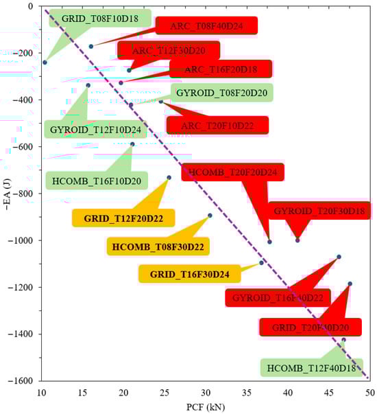Figure 9 presents a two-dimensional scatter plot of the PCF and EA crashworthiness criteria, visualising the results of the Taguchi experimental design. A modified Pareto front approach is employed, where EA values are normalised (multiplied by −1) to position the ideal scenario—simultaneously low PCF and high EA—in the lower-left corner, defined as the utopia point.