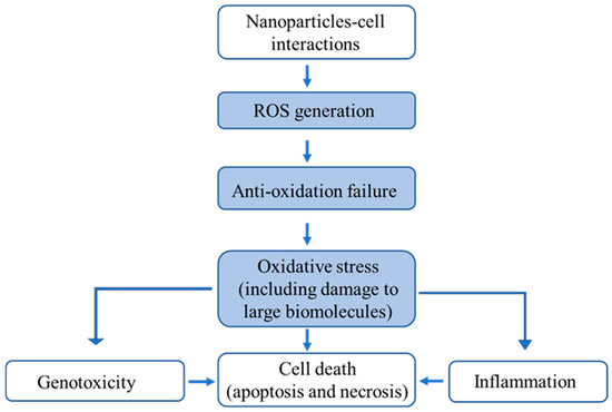 The cytotoxicity resulting from excessive ROS production by nanoparticles (NPs) [27].