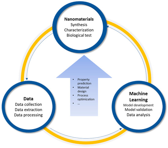 For instance, titanium dioxide (TiO2) NMs have been extensively studied through density functional theory (DFT), which enables the accurate prediction of crystal structures and their associated photocatalytic properties [29]. To further address these challenges and deepen our mechanistic understanding, machine learning (ML), a core component of artificial intelligence (AI), has been increasingly applied to diverse tasks in the NMs field, including property prediction, material design, and process optimization [30,31,32,33,34,35,36,37,38,39,40,41,42,43] (Figure 2). Take the nanotoxicity as an example, researchers have constructed quantitative structure-activity relationship (QSAR) models based on datasets of 30 distinct metal oxide nanoparticles (MeONPs) to predict their inflammatory potential [44]. Complementary DFT analyses further revealed that MeONPs with lower metal electronegativity and positive f-potential were more prone to disrupt lysosomal integrity, thereby triggering inflammatory responses. Building on these advances, this review provides a comprehensive overview of how ML is being integrated to investigate and forecast the ROS-related behaviors of primary types of NMs—including metal oxide, metal-based, and carbon-based NMs [45]—with a particular emphasis on their capacities to induce or scavenge ROS.
