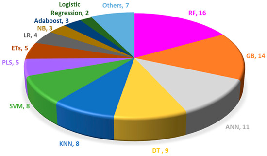 The distribution of algorithms used across the reviewed studies. ANN: artificial neural network; RF: random forest; GB: gradient boosting; KNN: k-nearest neighbor; DT: decision tree; SVM: support vector machine; PLS: partial least squares; LR: linear regression; ETs: extremely random trees; NB: naive bayes; Others: other algorithms.