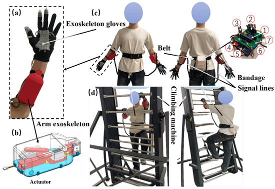 Overview of the assistive fall prevention exoskeleton system for tower climbing. (a) Single-arm exoskeleton. (b) Perspective view of the actuator structure. (c) Schematic diagram of the overall system worn by the user. Components of the control box: 1. STM32; 2. linear voltage conversion module; 3. Bluetooth module; 4. system main switch; 5. step-down module; 6. battery; 7. control board. (d) Simulating the actual climbing scenario using a climbing machine.