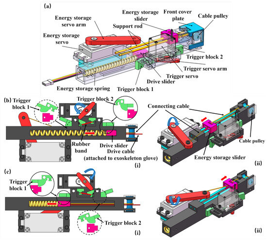 As shown in Figure 2b, during the energy storage phase, the trigger servo rotates clockwise to pivot trigger block 1, removing the shape constraint on the drive slider and allowing it to move freely along the sliding channel. The energy storage servo then rotates clockwise, and its arm pulls the energy storage slider leftward via a connecting cable. The connecting cable involving stroke-amplifying pulley mechanism connects the energy storage slider to the drive slider, causing the drive slider to move rightward in the opposite direction. Once the drive slider passes trigger block 2, it is mechanically constrained. At this point, the drive slider reaches its rightmost position, closest to the glove side, and the drive cable connecting the drive slider and glove remains slack due to its fixed length, ensuring no force is transmitted to the exoskeleton glove. The spring is fully stretched and remains tensioned without external force, as its position is secured by the constraint between trigger block 2 and the drive slider. The energy storage servo then rotates counterclockwise to return to its initial position, preparing for the next cycle; during this time, the cable between the energy storage servo and the energy storage slider becomes slack. By this time, the energy storage phase is complete.