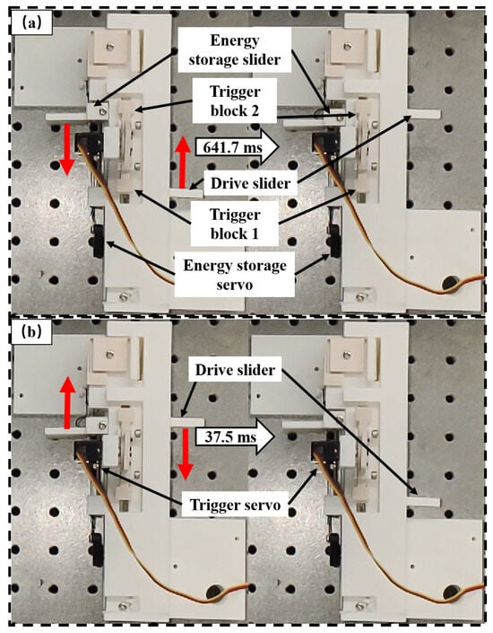 Actuator speed test. (a) Energy storage phase: The energy storage servo rotates, pulling the energy storage slider downward and the drive slider upward. Once the drive slider is constrained by trigger block 2, the energy storage servo and slider return to their initial positions. (b) Energy release phase: The trigger servo pivots to release trigger block 2, allowing the spring to rapidly pull the drive slider downward until it is constrained by trigger block 1.