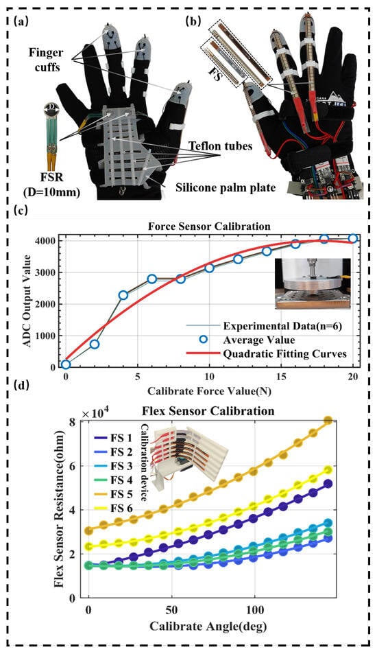Exoskeleton glove overview and sensor calibration. (a) Front view of the exoskeleton glove. (b) Back view of the exoskeleton glove. (c) Thin-film pressure sensor calibration results. (d) Flexible bending sensor calibration results.