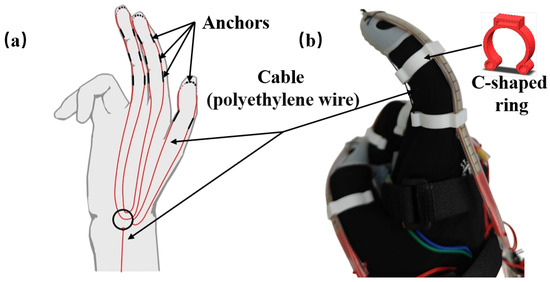Figure 6a,b show the detailed cable routing layout. A differential wiring scheme [19] is adopted to reduce the number of actuators and overall system complexity while still ensuring balanced force distribution across the thumb, index, and middle fingers. To facilitate effective force transmission and minimize deformation of the wearable structure, three sets of anchor points are arranged along each finger. The distal anchor point is located on the dorsal side of the fingertip (near the nail) and is directly provided by the finger cuff, whereas the middle and proximal anchor points are realized through rings fixed onto the glove and connected to the finger sleeves.