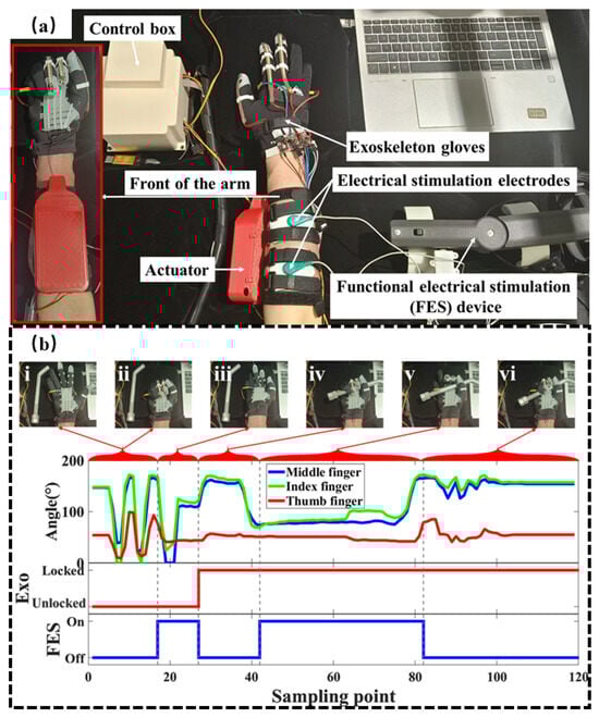 The experimental setup is illustrated in Figure 7a. To maximize the effectiveness of the FES test, extensive pre-experimental testing was conducted to determine the optimal electrode placement and stimulation voltage. Ultimately, the most effective configuration involved placing two electrodes on the forearm’s extensor digitorum muscle—approximately 8 cm from the wrist and 8 cm from the elbow—and applying a stimulation voltage of 15 V. Under this stimulation, the hand achieved significant extension with notably enhanced tension. The experiment was divided into two main phases: In the first phase, the exoskeleton remained in an unlocked state, and FES was alternately activated and deactivated to validate its effectiveness. In the second phase, with the exoskeleton in a locked state, FES was again toggled to assess the exoskeleton’s locking performance and its anti-fall capability. During the entire procedure, flex sensors embedded in the soft exoskeleton glove continuously recorded finger joint angles in real time to analyze hand motion under different conditions.