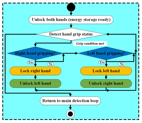 To validate the overall effectiveness of the soft exoskeleton system for fall prevention assistance during tower climbing, a simulated climbing experiment was conducted. The system assumes that the feet remain stably positioned on the climbing structure. Under this assumption, the control workflow (Figure 8) ensures that one hand is always locked while the other remains free to move, thereby maintaining a stable three- or four-point contact posture throughout the climbing process and enhancing safety [52]. Grip state recognition, which is critical for enabling timely locking, is determined by a sensor voltage threshold calculated from a weighted combination of all sensing signals. This threshold was empirically obtained through repeated grasping trials on the foot peg by a single participant, with weighting factors manually tuned to reflect the relative contributions of each sensing modality. Although effective in practice, this approach would benefit from further refinement and validation across a broader range of users. The experiment was conducted on a climbing machine inclined at an angle of 72.35°, closely approximating the actual climbing angle of tower workers. Prior to the experiment, the participant underwent safety training for the climbing machine, and the entire process was recorded from both front and rear views.