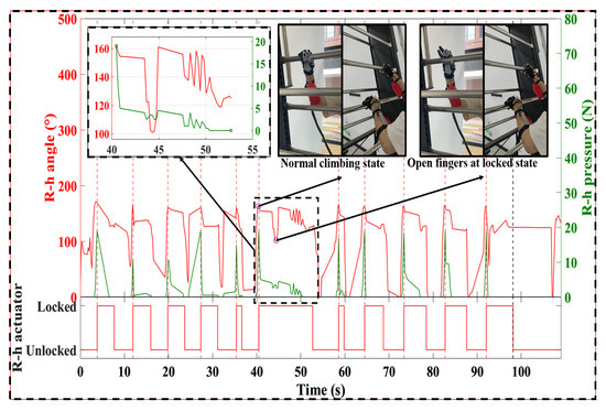 Climbing test results. R-h angle: right-hand flexion angle and R-h actuator: right-hand actuator states. R-h pressure: right-hand pressure.
