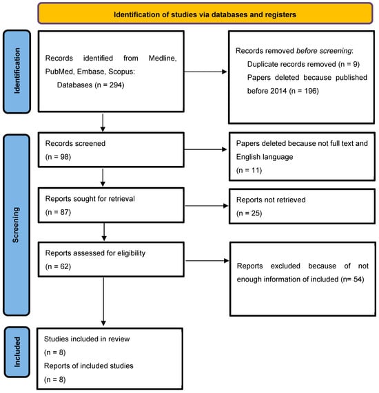 The selected included articles were from 2014 to 2024. Some researchers independently conducted database searches based on the specified criteria. Initially, 294 records were retrieved from various electronic databases. After excluding articles published before 2014 and removing duplicates, 98 studies remained. Subsequently, 20 manuscripts were excluded because of a lack of full-text availability and/or not being written in English, resulting in 87 studies. Further screening led to the exclusion of 79 articles due to insufficient relevant data, leaving a final total of 8 publications included in the review (Table 1).