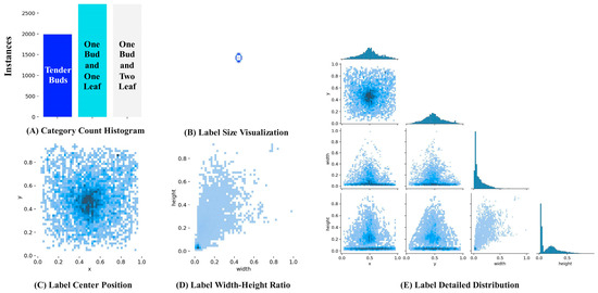 In this study, a total of 2364 images of Yunnan large-leaf tea trees were collected, covering tender buds, one bud and one leaf, and one bud and two leaves. In the data preprocessing stage, 2147 high-quality images were selected to construct the original dataset after eliminating the blurred, repeated and invalid images. As shown in Figure 1, Figure 1A is the histogram of the number distribution of three types of fresh leaf labels. Figure 1B shows the size distribution of the label in the width and height dimensions, and the center points of all labels are normalized to the image center. Figure 1C shows the spatial distribution characteristics of the label in the image coordinate system. Figure 1D is the visualization of the width-to-height ratio distribution of the annotation box. Figure 1E further shows the detailed features of the label in the image [20].