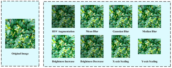 To enhance the robustness and generalization capability of the yield detection model for Yunnan large-leaf tea trees in complex environments, this study further introduces HSV (Hue, Saturation, Value) color space perturbation, filtering-based data augmentation, brightness transformation, and random scaling along the X and Y axes, as illustrated in Figure 2. Among them, HSV augmentation applies random perturbations to the hue, saturation, and value channels to simulate variable illumination, color temperature shifts, and device-specific imaging differences. This enhances model stability in complex color environments. Mean Blur replaces pixel values with the mean of their neighbors, reducing interference from local details and simulating images at different resolutions or compression levels. This improves model stability under varying image quality conditions. Gaussian Blur smoothens the image through Gaussian kernel function, which can effectively simulate the slight blur caused by UAV in high-speed flight or imaging jitter, so as to improve the feature extraction ability of the model in low-definition images. Median Blur is primarily used to remove salt-and-pepper noise while preserving edge details and strengthening structural features of the image, thereby improving detection of edges and structural information in complex backgrounds. Brightness Adjustment randomly adjusts the overall brightness of the image to simulate the natural lighting conditions of different time periods such as early morning, noon and evening, so as to enhance the stability and generalization ability of the model in various lighting environments. Random Scaling on the X and Y axes performs the scale transformations of different ratios along the horizontal and vertical directions, expanding the scale diversity in the training samples and increasing model robustness and detection accuracy for targets under changes in viewpoint and size [21].