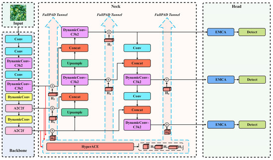 As one of the leading-edge networks in the field of object detection in recent years, YOLOv13 incorporates HyperACE (Hypergraph-based Adaptive Correlation Enhancement) while maintaining end-to-end detection efficiency, which substantially improves its capacity for modeling global multi-scale features [22]. However, when applied to the yield detection of Yunnan large-leaf tea trees, a task characterized by complex back-grounds, small target sizes, significant morphological variations, and severe occlusion in remote sensing imagery, the model still exhibits notable deficiencies in multi-scale feature representation and bounding box localization accuracy.