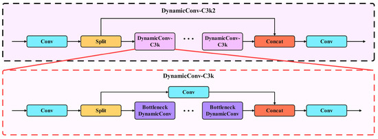 As illustrated in Figure 4, the improved DynamicConv-C3k2 adopts an overall backbone branch architecture. For the input feature map, a Conv first adjusts the channels to the target dimension. The adjusted features are then separated into a main path and a residual branch. The main path is formed by a series of DynamicConv-C3k blocks that extract deep semantic features, while the residual branch preserves the unaltered input as residual information to mitigate feature degradation. After the two parts are fused through feature concatenation, a Conv performs channel consolidation and information integration to produce the final output features.