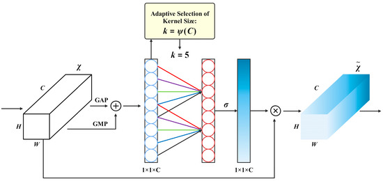 After performing Global Max Pooling and Global Average Pooling on the input features and fusing them, a channel response vector y of length C is obtained. Cross-channel interaction is then established along the channel dimension. Here, represents the neighborhood width, which is the size of the 1D convolutional kernel, as shown in Equation (6). In this, represents the reverse mapping from the number of channels to the kernel size, is the mapping hyperparameter, and denotes an operator that selects the nearest number. denotes the bias term of the mapping function.