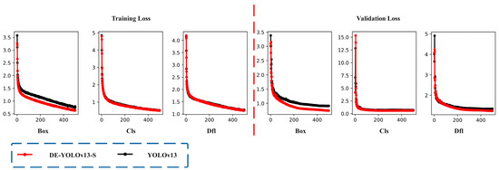 The loss function is one of the core components in the deep learning model, which is mainly used to quantitatively evaluate the deviation between the predicted value of the model and the real label [37,38,39,40]. In the yield detection task of large-leaf tea trees in Yunnan, the loss value can effectively reflect the accuracy of the model in target location and category recognition. The lower the loss value, the more accurate the model’s detection of tea tree yield targets, and the better the overall performance. As shown in Figure 7, the loss of DE-YOLOv13-S converges slightly faster than that of the original YOLOv13. On the training set, the Box Loss, Cls Loss, and DFL Loss of DE-YOLOv13-S stabilize below 0.65, 0.52, and 1.15, which are decreases of 18.75%, 3.70%, and 2.54% compared with the original YOLOv13 values of 0.80, 0.54, and 1.18. On the test set, Box Loss, Cls Loss, and DFL Loss stabilize below 0.75, 0.60, and 1.24, which are decreases of 18.48%, 14.29%, and 7.46% compared with the original YOLOv13 values of 0.92, 0.70, and 1.34. These results show that the optimized DE-YOLOv13-S improves detection accuracy and generalization.
