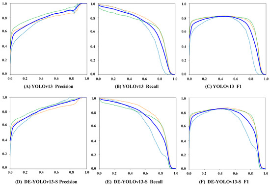 Precision Recall and F1 comparison chart. Note: In all subfigures, the X axis represents the confidence threshold. The Y axis of (A,D) corresponds to Precision, that of (B,E) corresponds to Recall, and that of (C,F) corresponds to F1. The thin blue line represents one bud with two leaves, the thin red line represents tender buds, the thin green line represents one bud with one leaf, and the thick blue line represents all categories.