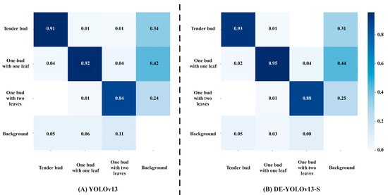The confusion matrix can visually present the classification performance of the model in the research on the yield detection of Yunnan big leaf tea tree [41]. As shown in Figure 9, the rows correspond to the real tea categories, and the columns correspond to the prediction results of the model. The deeper the color of the diagonal elements and the closer the value to 1, the higher the recognition accuracy of the model for the fresh leaves of this category. Non-diagonal elements reflect the degree of confusion between different categories. The non-zero elements at the lower left of the diagonal correspond to the undetected fresh tea leaves, and the non-zero elements at the upper right correspond to the wrongly detected fresh tea leaves. The results show clear improvements over the original YOLOv13. The detection accuracy for Tender bud increases by 1 percentage point, for One bud with one leaf by 3 percentage points, and for One bud with two leaves by 4 percentage points. DE YOLOv13 S effectively reduces confusion between small-scale targets and visually similar categories, thereby improving the reliability of yield detection.