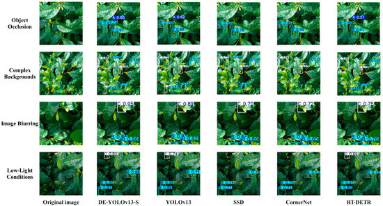 To further verify the detection ability of DE-YOLOv13-S in the tea yield detection task and verify its overall advantages in the tea yield detection task, this study conducted external verification for low-light conditions, image, complex backgrounds, and object occlusion [42]. The external verification data were collected from Yunnan Agricultural University in Kunming, Yunnan Province. The results are shown in Figure 10. DE-YOLOv13-S still maintains high detection accuracy in a variety of complex environments, and can accurately capture and locate the target of fresh tea leaves. Compared with the original YOLOv13, the undetected rate and confidence are significantly reduced.