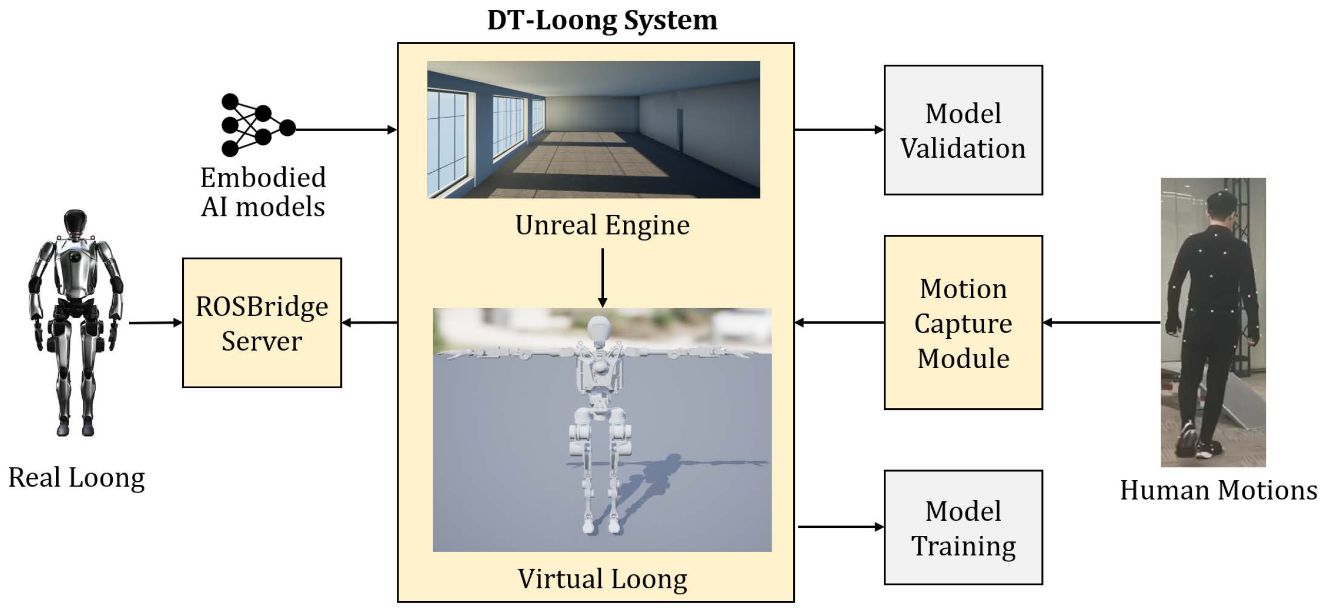 Figure 1. By replicating real-world environments and the bionic robot Loong  equipped with an IMU (Inertia Measurement Unit) and visual sensors, we build a digital environment using UE5 (Unreal Engine 5). A MoCap (Motion Capture) system with a delicately designed retargeting algorithm is used to convert human data into humanoid robot data for further training. Beyond data collection, DT-Loong  also serves as a platform to test the applicability of embodied AI models, promoting the development of more bio-inspired intelligence. In addition, when Loong is deployed in monitoring and patrolling scenarios, DT-Loong  can predict the Loong ’s actions and alert human operators of a surveillance system.