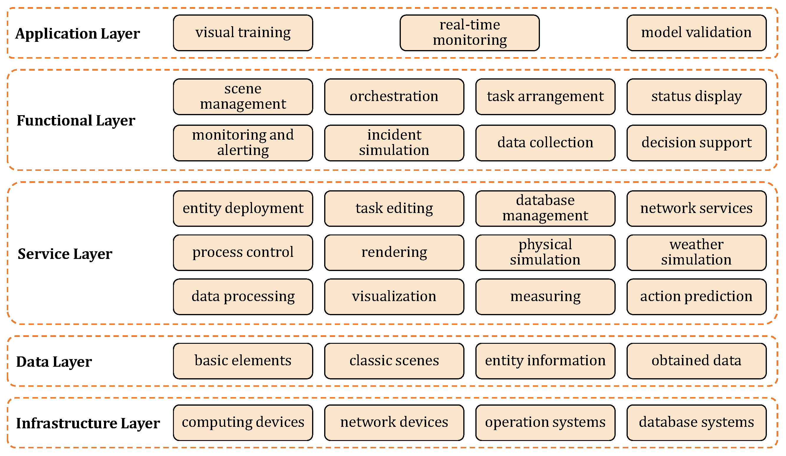 The application layer represents the system’s usage, including data collection from visual demonstrations, real-time monitoring for patrol tasks, and algorithm validation to enhance humanoid behaviors. The functional layer manages essential features such as scenario setup, orchestration, task arrangement, etc. The service layer provides core system services, establishing foundational capabilities related to entities, processes, simulations, and associated functionalities. The data layer is responsible for managing data resources, and the infrastructure layer provides the necessary hardware and software environment.