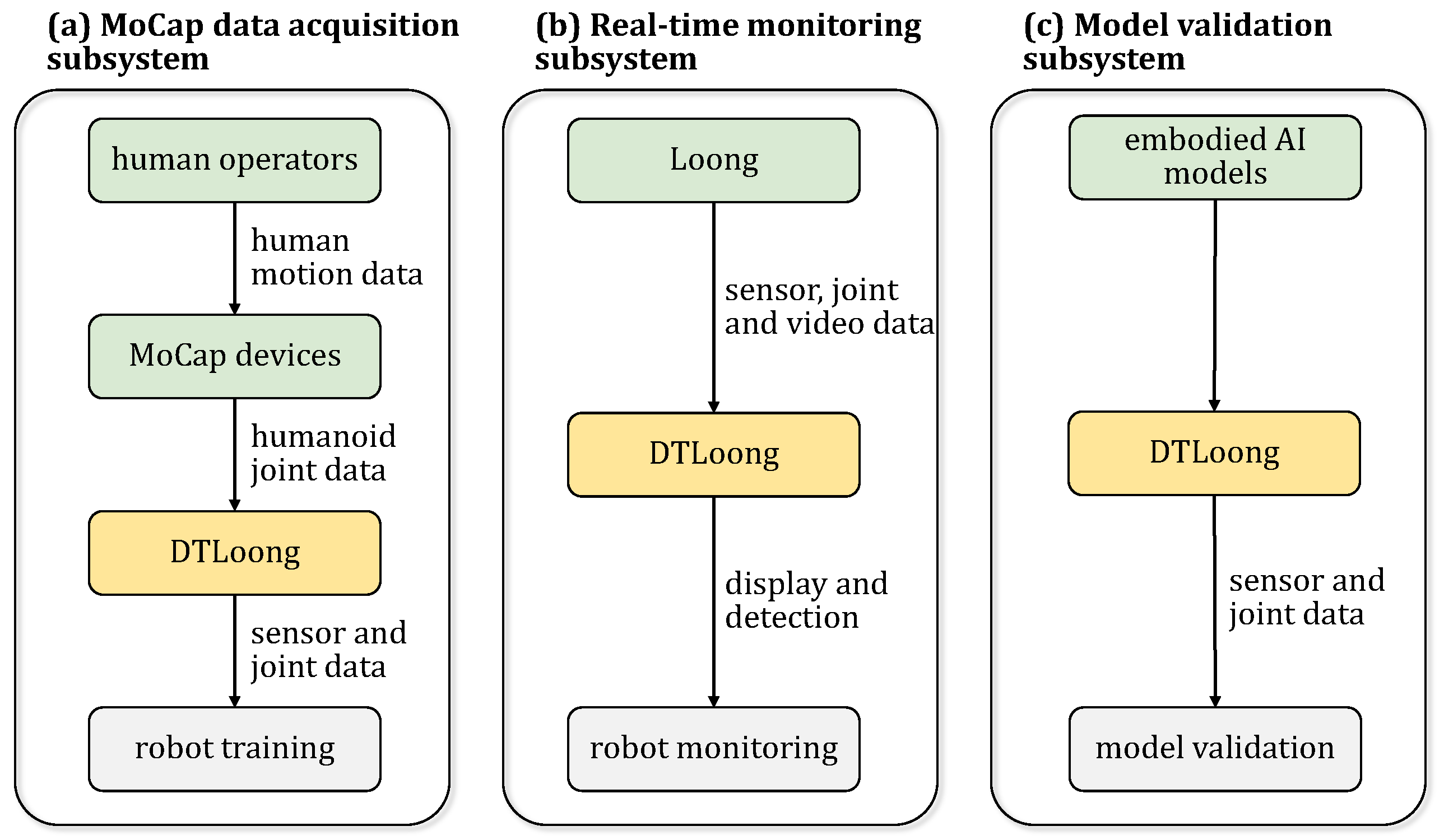 Targeted at preparing data for humanoid imitation learning, the MoCap data acquisition subsystem employs optical motion capture technology to obtain Cartesian-space coordinates that represent human body motions, which are then mapped into the joint-space coordinates of Loong. After integrating these data into DT-Loong, the system outputs IMU data, camera data, and humanoid joint data in hdf5 files for subsequent robot model training.