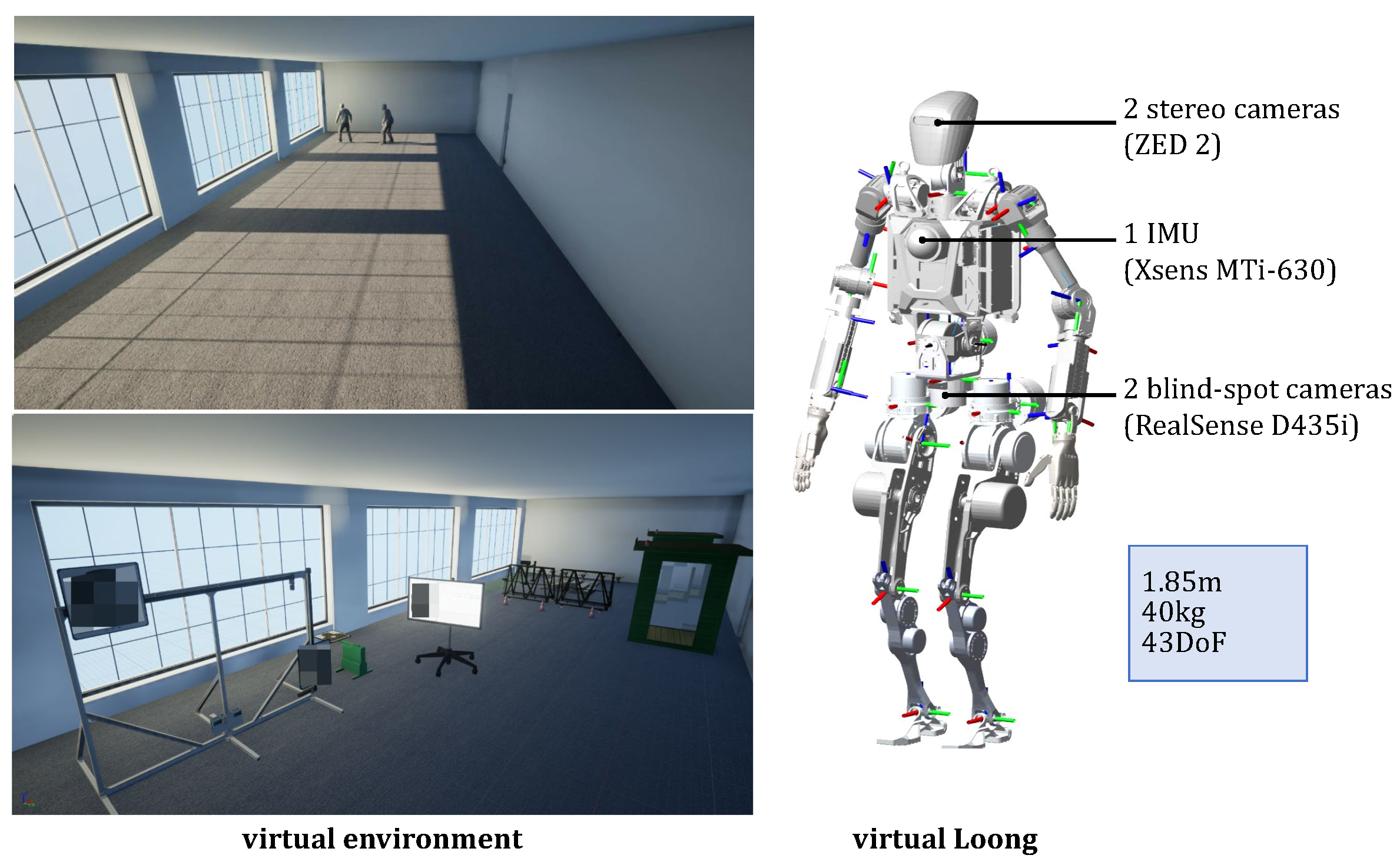 https://www.openloong.org.cn/cn/documents/robot/product_introduction (accessed on 13 October 2025) is an open-source bionic humanoid robot with 43 degrees of freedom (DoF), a height of 1.85 m, and a weight of 40 kg. Featuring a human-like joint design focused on the hip, waist, knee, and ankle regions, Loong is capable of fast walking, agile obstacle avoidance, stable uphill/downhill traversal, and robust impact resistance. To digitally represent Loong, we simplify the full-scale 3D model by reducing the number of faces and vertices and replicate its sensor setups. Specifically, two stereo cameras (ZED 2) are placed at Loong’s eyes, two blind-spot cameras (RealSense D435i, Intel Corporation, Santa Clara, CA, USA) are mounted at the middle of the body, and an IMU (Xsens MTi-630, Xsens, Enschede, The Netherlands) is positioned in the chest area.