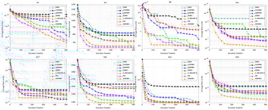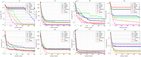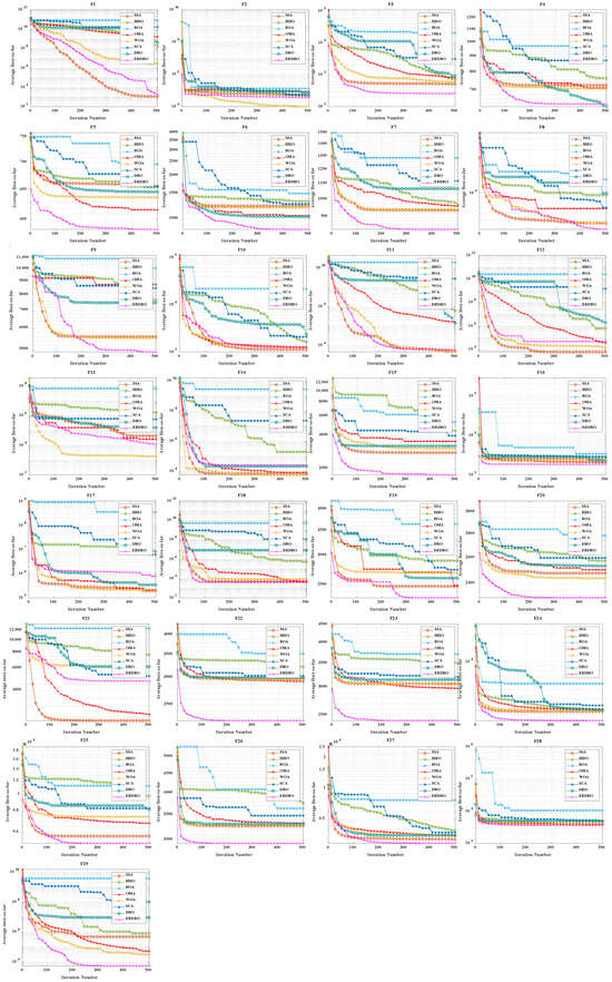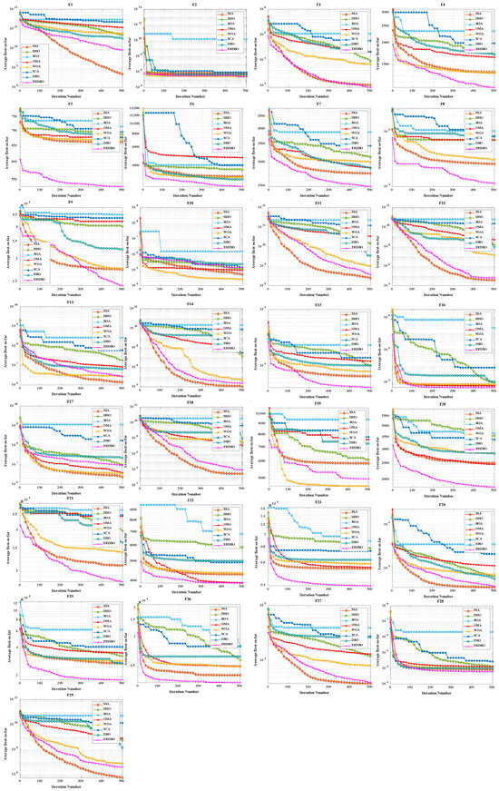To evaluate both convergence speed and solution accuracy, convergence curves were plotted for the 30- and 100-dimensional experiments, comparing the ERDBO with several competing algorithms, as illustrated in Figure 2 and Figure 3. In each subplot, the x-axis represents the iteration count, while the y-axis shows the average objective values obtained over 30 and 100 independent runs. The analysis of these curves yields the following insights: