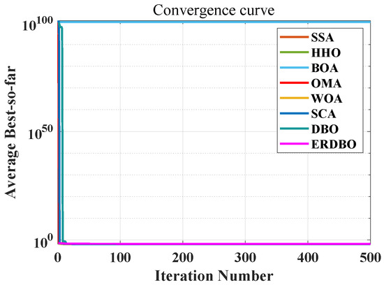 An analysis of Table 3 and Table 4 reveals that, in the 30-dimensional experiments, the ERDBO achieved the top-ranked solution in 14 of the 29 benchmark functions, reflecting its overall effectiveness. For the other 15 functions, although the absolute optimum was not reached, the ERDBO consistently provided high-quality suboptimal solutions, demonstrating its capability to handle a diverse set of problems. In the 100-dimensional experiments, a similar pattern is observed: the ERDBO secured the best result in 14 functions and produced robust suboptimal outcomes for the remaining cases. These findings indicate that the ERDBO maintains stable performance and robustness even in high-dimensional optimization scenarios. The subsequent sections present a more detailed discussion of these results.