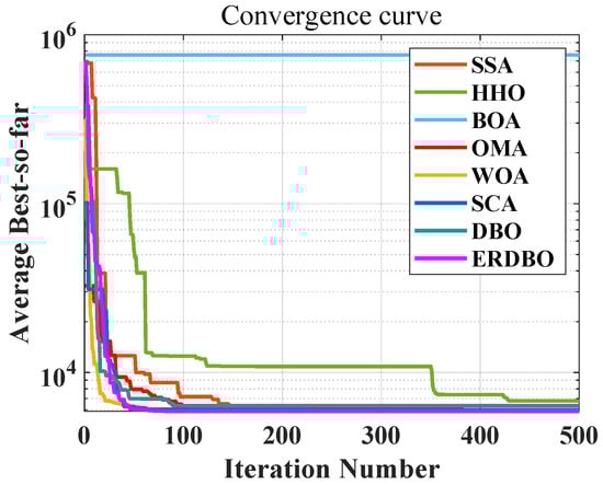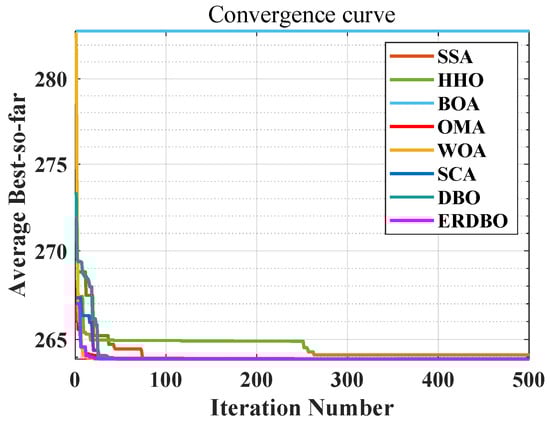 - For the simple multimodal functions F3–F9, the ERDBO demonstrated strong performance in the 30-dimensional experiments, achieving the highest rank in F3, F4, F6, F7, and F9. These results reflect the algorithm’s improved exploration ability and its effectiveness in avoiding local optima. Although the ERDBO was slightly outperformed by WOA and SCA in F5 and F8, it still significantly exceeded the original DBO and most other competing algorithms. In the 100-dimensional experiments, the ERDBO continued to perform well, attaining the top position in F4, F5, F8, and F9, which illustrates its robustness and scalability in higher-dimensional search spaces. While WOA and SCA occasionally achieved better results on specific functions, the ERDBO consistently produced competitive outcomes across the majority of the benchmarks. The overall advantage of the ERDBO over DBO further confirms the efficacy of the proposed algorithmic improvements.