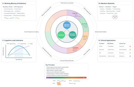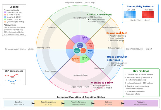 The investigation of human mental states through EEG necessitates bridging multiple theoretical traditions. Affective neuroscience has evolved from discrete emotion theories positing basic emotional categories to dimensional models characterizing affect along continuous axes of valence, arousal, and dominance (Russell’s circumplex model and its extensions). Cognitive frameworks range from Baddeley’s working memory model with its central executive and subsidiary systems to cognitive load theory, distinguishing intrinsic, extraneous, and germane processing demands [2,27,28,29,30,31].
