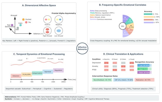 The scientific investigation of emotion through neuroscience has undergone paradigmatic shifts paralleling technological advances in brain measurement. Early theories proposing limbic system dominance in emotional processing have given way to network-based models recognizing the distributed nature of affective processing across cortical and subcortical structures [231]. Contemporary frameworks acknowledge that emotions emerge from the dynamic interplay of multiple brain systems rather than activation of dedicated emotional circuits [232,233,234]. The constructionist perspective, gaining empirical support from neuroimaging meta-analyses, suggests that emotions arise from the combination of domain-general neural networks implementing core affective feelings (valence and arousal) with conceptual knowledge that categorizes these feelings into discrete emotions. This view reconciles the apparent universality of certain emotional expressions with the substantial cultural variation in emotional experience and categorization. Electroencephalographic evidence supports this integration, showing that similar patterns of frontal alpha asymmetry can underline different discrete emotions sharing similar motivational orientations [235,236,237].
