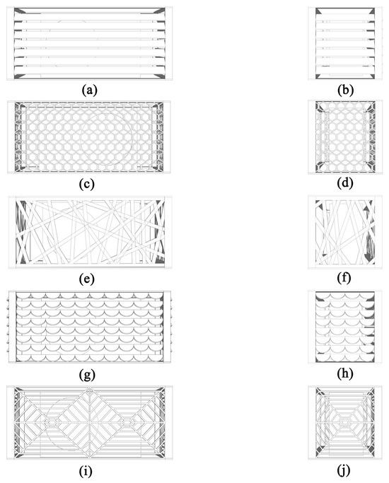 Bionic design of the outer machine enclosure structure: (a) front of the blade structure; (b) side of the blade structure; (c) front of the honeycomb structure; (d) side of the honeycomb structure; (e) front of the bird’s nest structure; (f) side of the bird’s nest structure; (g) front of the fish scale structure; (h) side of the fish scale structure; (i) front of the spider web structure; and (j) side of the spider web structure.