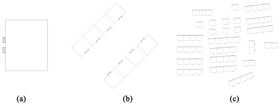 In order to verify the efficiency of the design of the bionic envelope structure of the air conditioner outdoor unit on the improvement of the wind environment, after obtaining the standard building model and the bionic structure model, three types of volumes—namely, single building, townhouse building, and typical community—were used for simulation and comparison experiments. The single building is a rectangular simplified model with a size of 12 m × 10 m × 27 m. The outdoor unit of the air conditioner is placed on the north side of the building, and the height from the ground is 1.9 m, as shown in Figure 4a. At this scale, the independent ventilation efficiency of each bionic structure can be verified; the single side of the townhouse building is spliced from four single buildings, and the single column size is 48 m × 10 m × 27 m. The outer machine enclosure structure is set on the side walls on both sides of the corridor, the building spacing is 25 m, and the building orientation is 135°, as shown in Figure 4b. At this scale, the ventilation efficiency of the simple street form of the bionic structure can be verified; the typical community selects the typical old community characteristics of Donghu District, Nanchang City, Jiangxi Province for the simulation. The community covers an area of about 28,500 m2, and consists of a group of five units, 11 groups of four units, and a group of three units. The townhouse building, a combined building consisting of 3 groups of two buildings, and eight single buildings, as shown in Figure 4c, verify the comprehensive ventilation efficiency of the bionic structure.