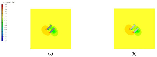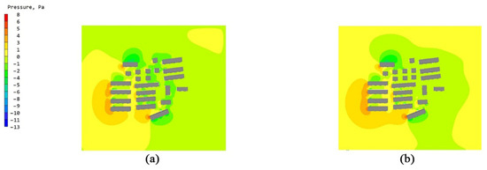 The overall flow field of the townhouse was channel flow, and the formation of the corridor caused the narrow tube effect. In order to explore the changes in the efficiency of the air conditioning outdoor unit bionic structure in such a wind environment, two townhouses of the townhouses composed of building units were imported into PHOENCIS software for simulation. After the simulation test, the spider web structure still had the most significant impact on the ventilation efficiency of the townhouse. The simulated wind speed at the pedestrian walkway (1.5 m) of the original structure is shown in Figure 11a,b; the wind pressure is shown in Figure 12a,b; and the average wind speed of the six structures at some standard floor heights is shown in Table 6.