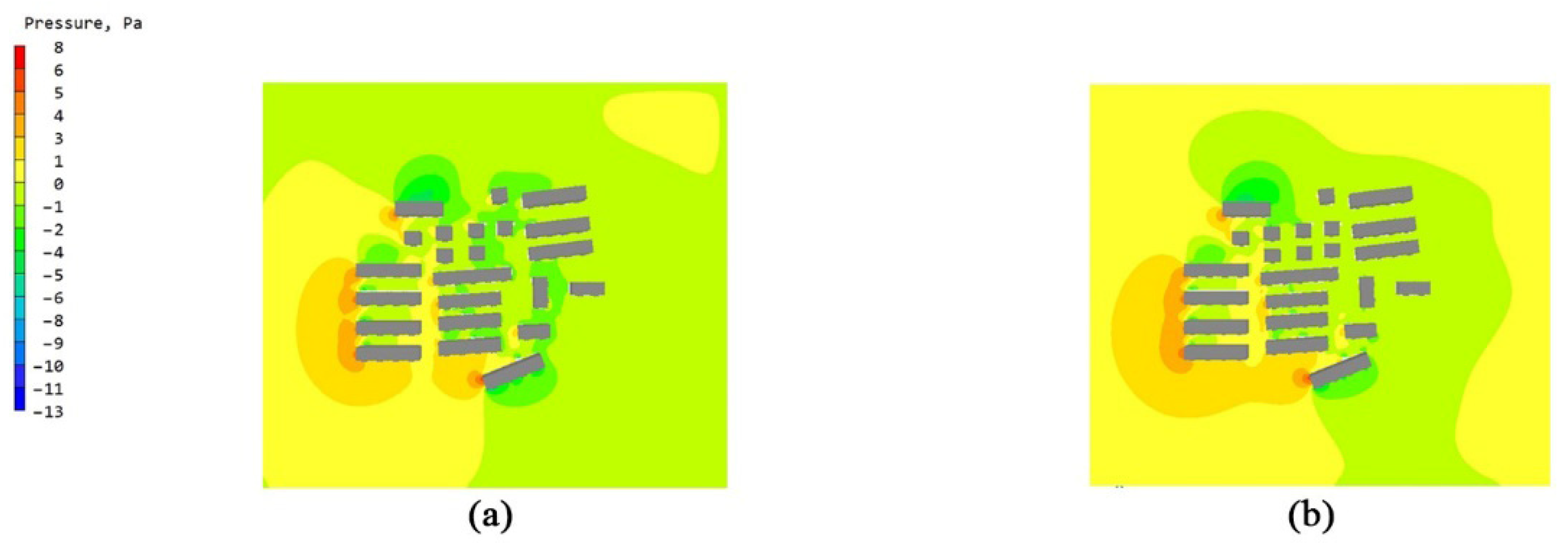 - According to the specifications and previous research, the wind pressure difference exceeding 3 pa between the windward and leeward sides of the building is used as the evaluation standard for natural ventilation.