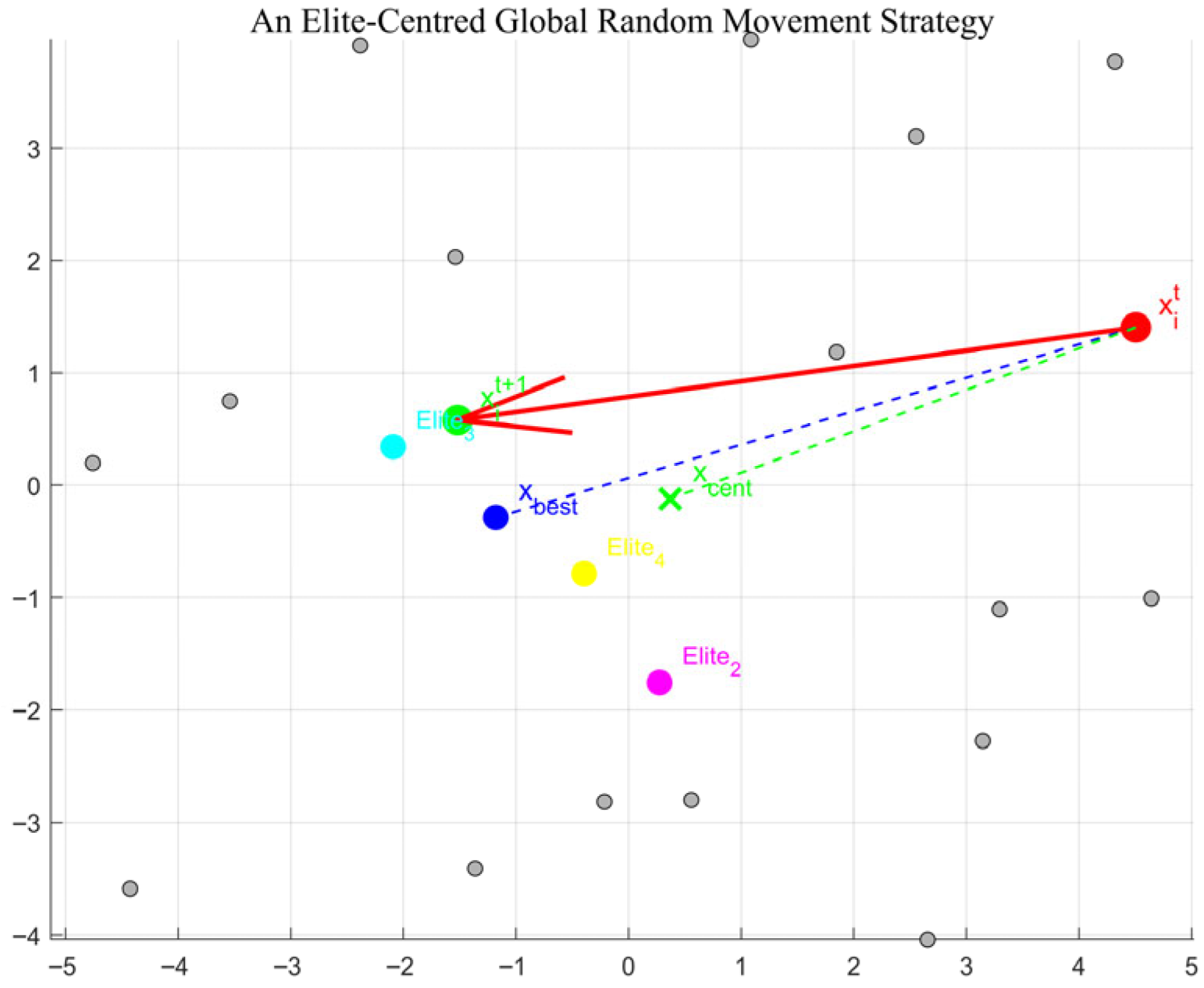 - We proposed an elite-centered global random movement strategy that balances elite guidance and global diversity, enhancing both the convergence speed and accuracy of the algorithm.