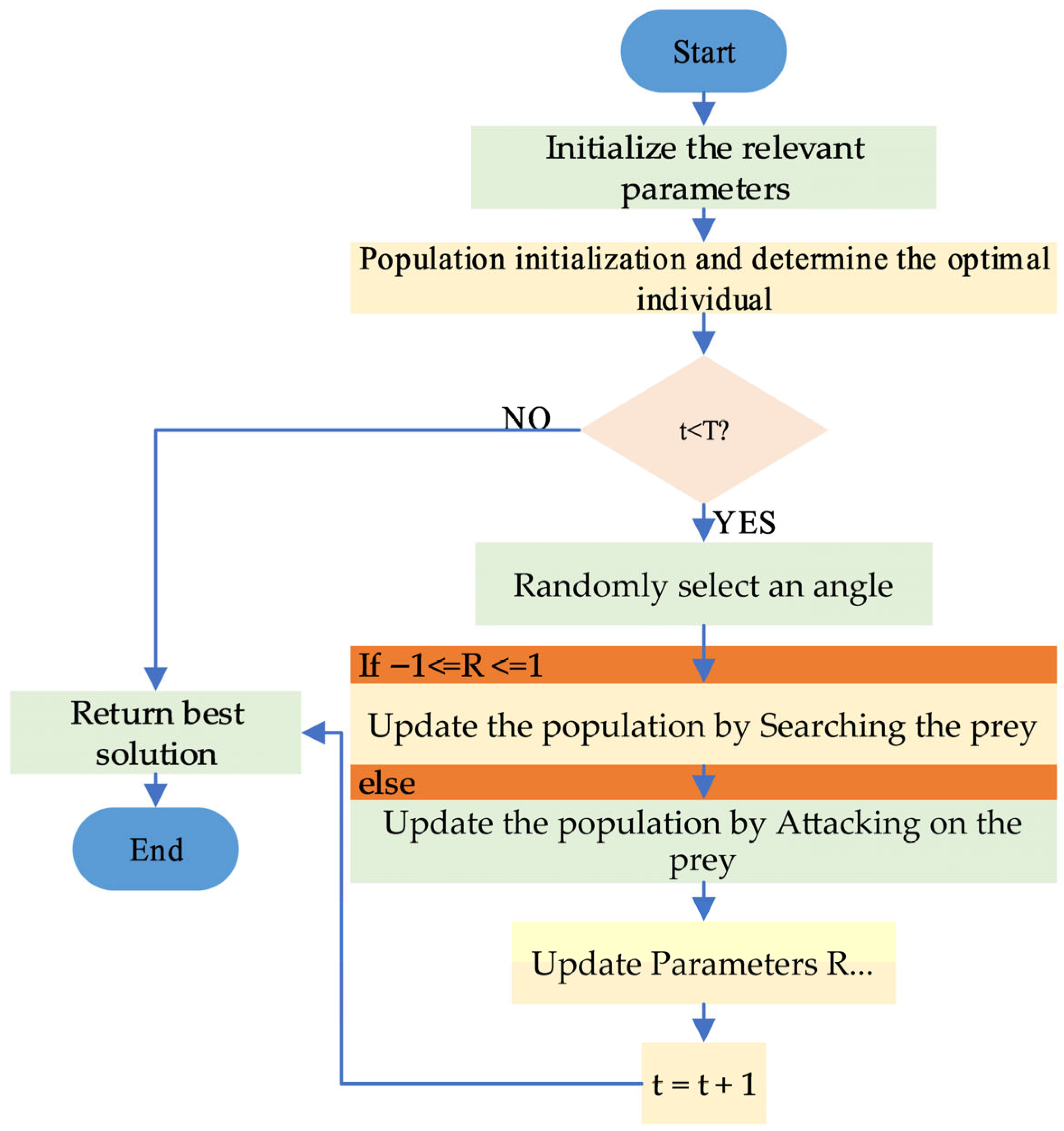 | 1: Begin 2: Initialize: the relevant parameters and population initialization. 3: Calculate the fitness value for each individual and determine the optimal individual. 4: do 5: do 6: Randomly select an angle between 0 and 360 degrees. 7: 8: Attacking on the prey (exploitation): 8: Update the population by Equation (7) 9: else: 10: Searching the prey (exploration): 11: Update the population by Equation (6) 12: End If 16: 19: End for 20: 21: End while 22: return best solution 23: end |