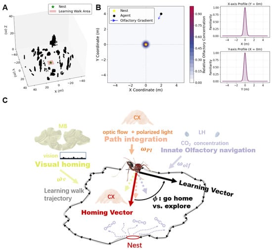 Due to its important role, the learning walk has garnered attention across various fields, including behavioural science [,,], neuroscience [,], and computational modelling [,]. Behavioural scientists have focused on collecting and analysing trajectory data from various ant species during their learning walks, providing valuable insights into the characteristics of real ants’ learning walks patterns, including empirical data on how trajectory coverage and maximum distance change with the number of learning walks [], as well as differences in trajectory tortuosity among different species []. Across successive learning walks, the exploration area expanded progressively, accompanied by the stepwise acquisition of the nest-centred visual panorama [,,]. In neuroscience, research has revealed that learning walks involve neuroplastic changes [,,] in the central complex (CX) and the mushroom body (MB), which have been shown to be heavily involved in multisensory-driven navigation tasks [,,]. These findings suggest that successful learning walks require specific environmental conditions, such as polarized light, magnetic fields, visual and olfactory cues, which assist ants in navigation. In computational modelling, common navigational tools used by ants—path integration, visual navigation, and olfactory cues—have been incorporated into models constrained by biological principles [,,]. These models simulate the biologically grounded transformation from ambient sensory inputs to navigational decisions, producing strategies that closely align with the behavioural patterns observed in real ants.