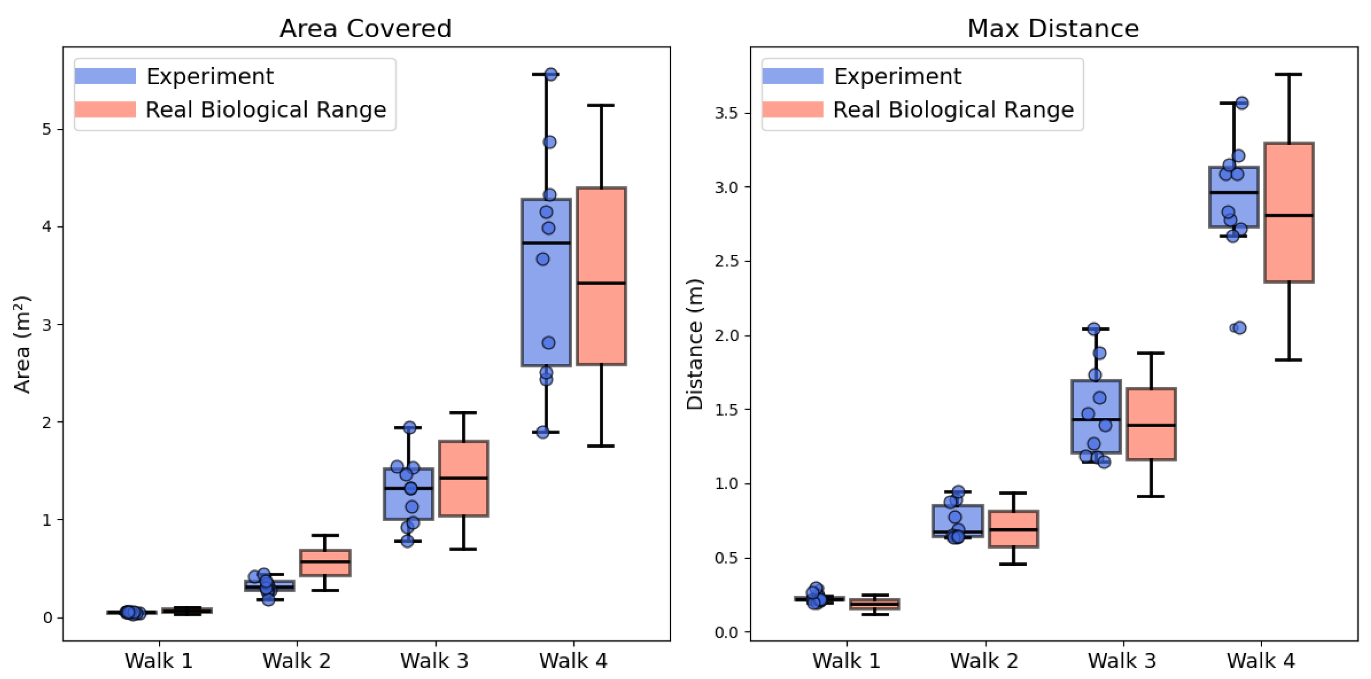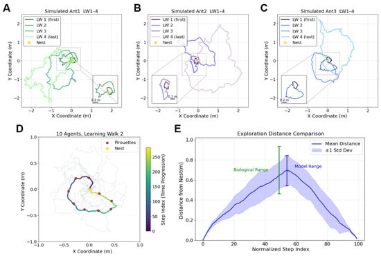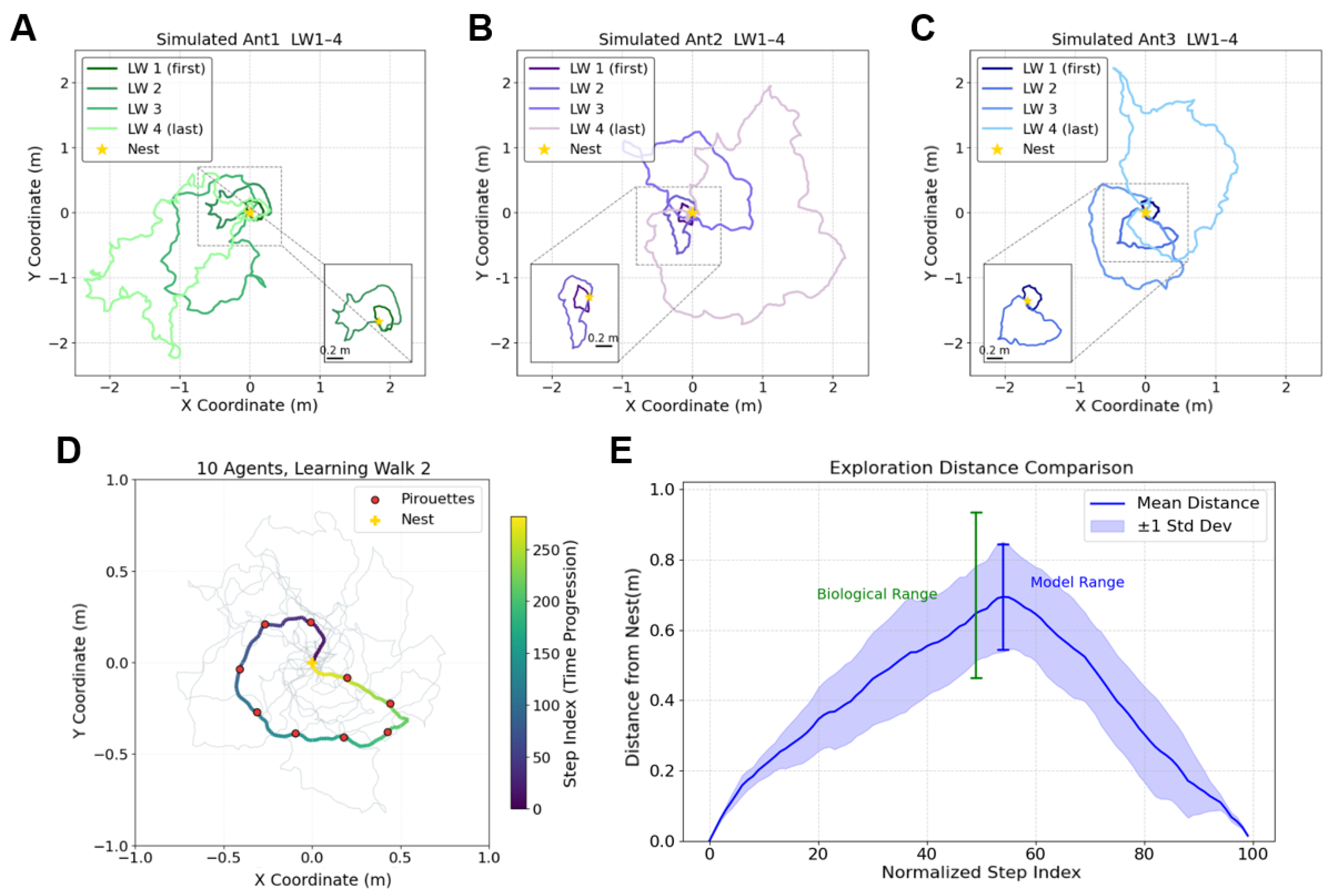 According to ethological studies of learning walks, trajectories analysis is often regarded as the primary approach to reveal the mechanisms underlying the ant’s learning walks. To align with this, we first generate the agent’s trajectories guided by the proposed learning walk model and then analysis them in a identical way as that in biological studies. The results are shown in Figure 2A–C, which presents four successive learning walks of three individual agents. Figure 2D shows the trajectories of the second learning walk of all agents. Consistent with real biological data, the ants progressively expanded their coverage with each additional walk: their exploration was initially concentrated near the nest and gradually extended outward [,,].