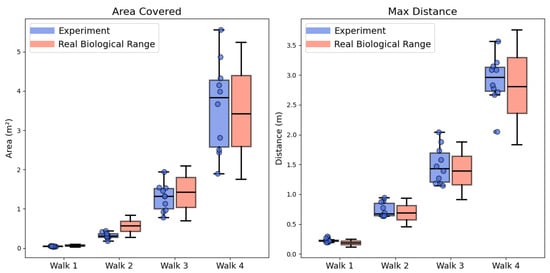 In this section, we first show how the proposed model could replicate the biological data on maximum trajectory distance and coverage area [] under similar experiment settings with a similarly rich visual environment. Then, the effectiveness of the visual learning driven by our learning walks model is evaluated by the agent’s solving visual homing task []. To explore this further, we examine whether our adaptive weighting mechanism can reproduce the transition of navigational strategies hypothesised in behavioural studies [,]. Finally, we found that by adjusting the parameters of the ‘pirouettes’, our model also provides a potential account for species-specific behaviours [].