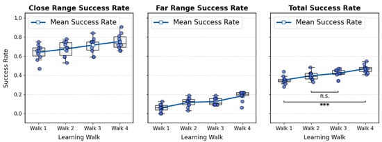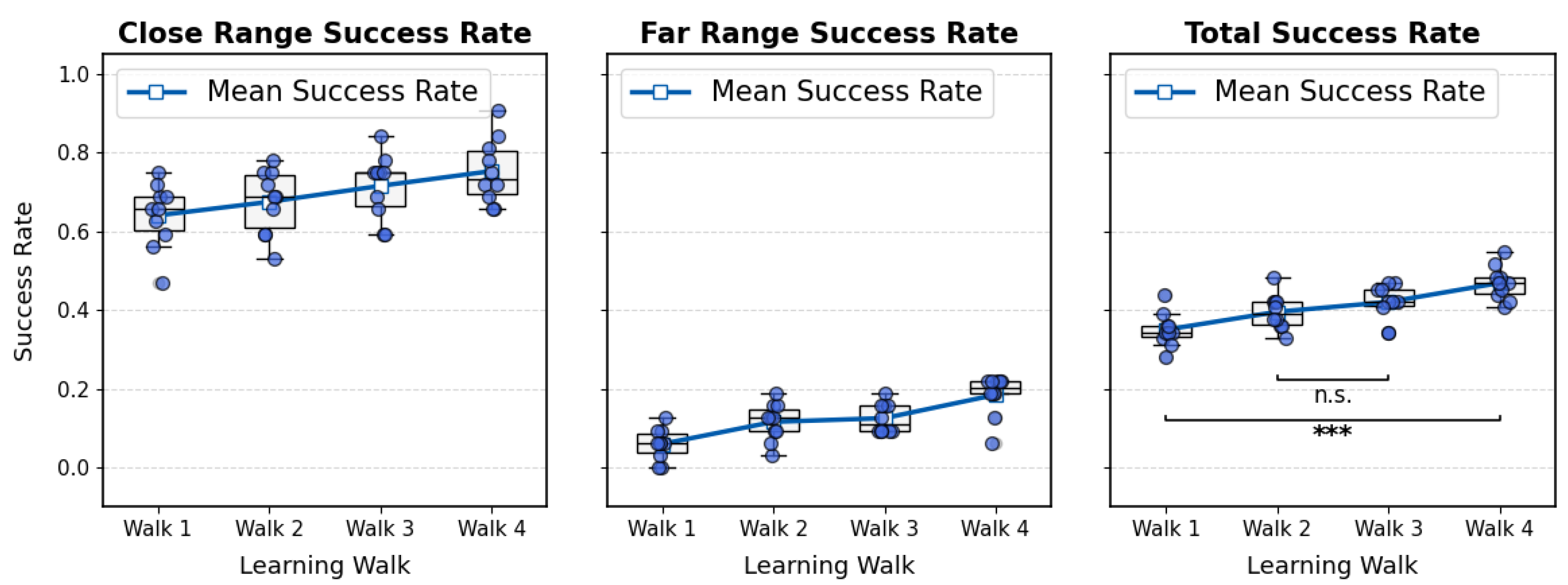 To quantify the effect of learning experience, we compared homing success rates between agents that had undergone different numbers of learning walks. Before performing pairwise comparisons, we first examined whether the data satisfied the normality assumption. For data that met this criterion, we used paired t-tests (Table 2) and reported effect sizes using Cohen’s d (Table 3). For data that violated the normality assumption, we applied Wilcoxon signed-rank tests and reported effect sizes as r values. The full statistical and effect size results for close-, middle-, and far-range comparisons are provided in the Supplementary Materials (see paired_ttest_results.xls).