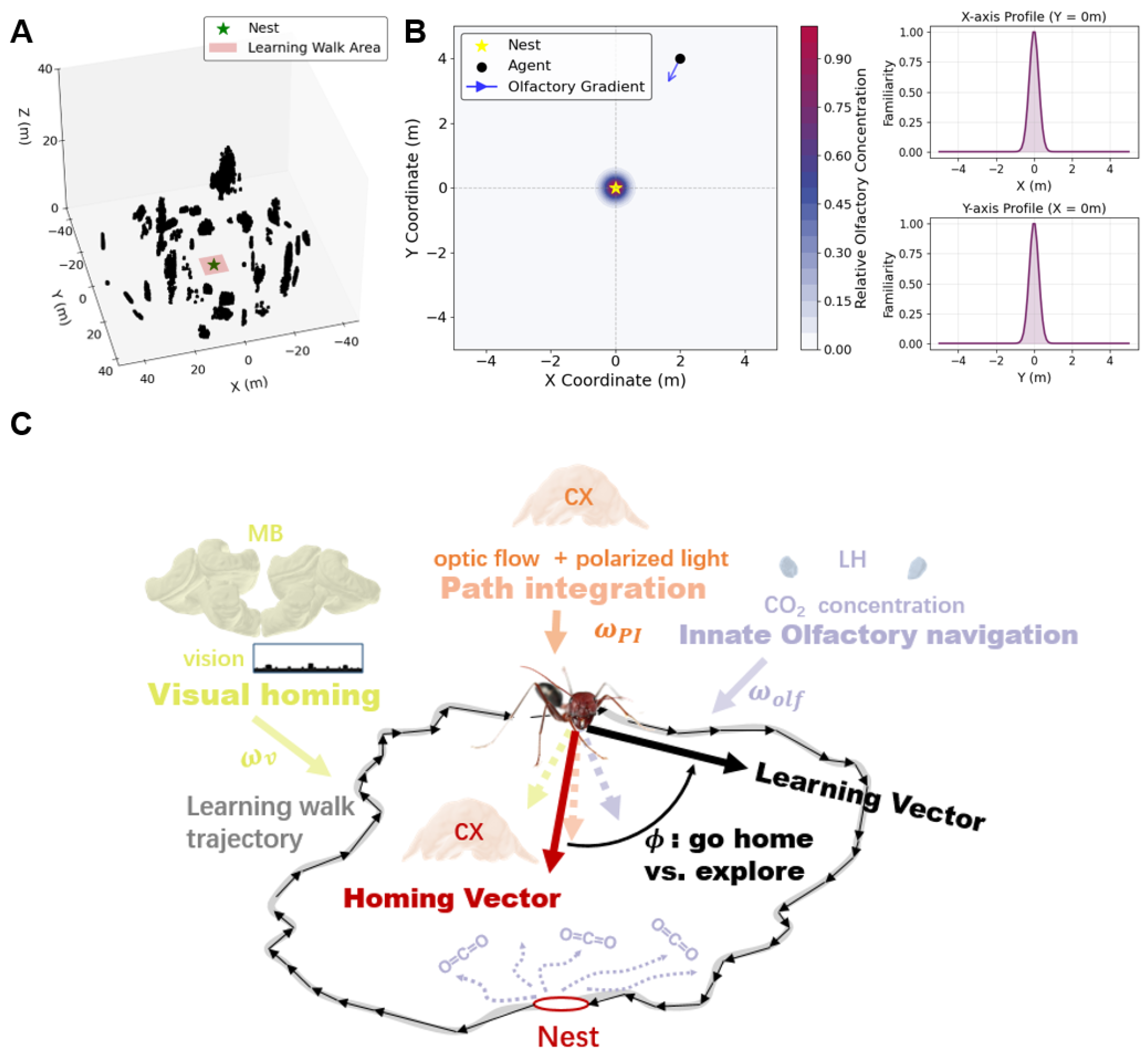 Multimodal sensory environment and model architecture for learning vector formation. (A) Three-dimensional rendering of the simulated terrain used during the learning walks. The nest is indicated by a green star, and the designated learning area is highlighted. (B) Top view of the olfactory gradient centred on the nest. The agent’s position and the local gradient direction are indicated. The right panel shows cross-sectional profiles of the odour concentration along the X and Y axes, illustrating the Gaussian symmetry of the distribution. (C) Schematic of the multimodal integration model. Involved brain regions include the central complex (CX) for path integration, the mushroom body (MB) for visual input, and the lateral horn (LH) for olfactory cues. These regions provide directional and familiarity-related signals that are ultimately integrated within the CX into a Homing Vector, which is further modulated by angular offset to generate the Learning Vector used for navigation decisions.The brain region illustration is adapted from https://www.insectbraindb.org/app/ (accessed on 30 April 2025), and the ant image is adapted from https://www.shutterstock.com/zh/image-photo/desert-ant-cataglyphis-bicolor-isolated-on-2163663957 (accessed on 30 April 2025).