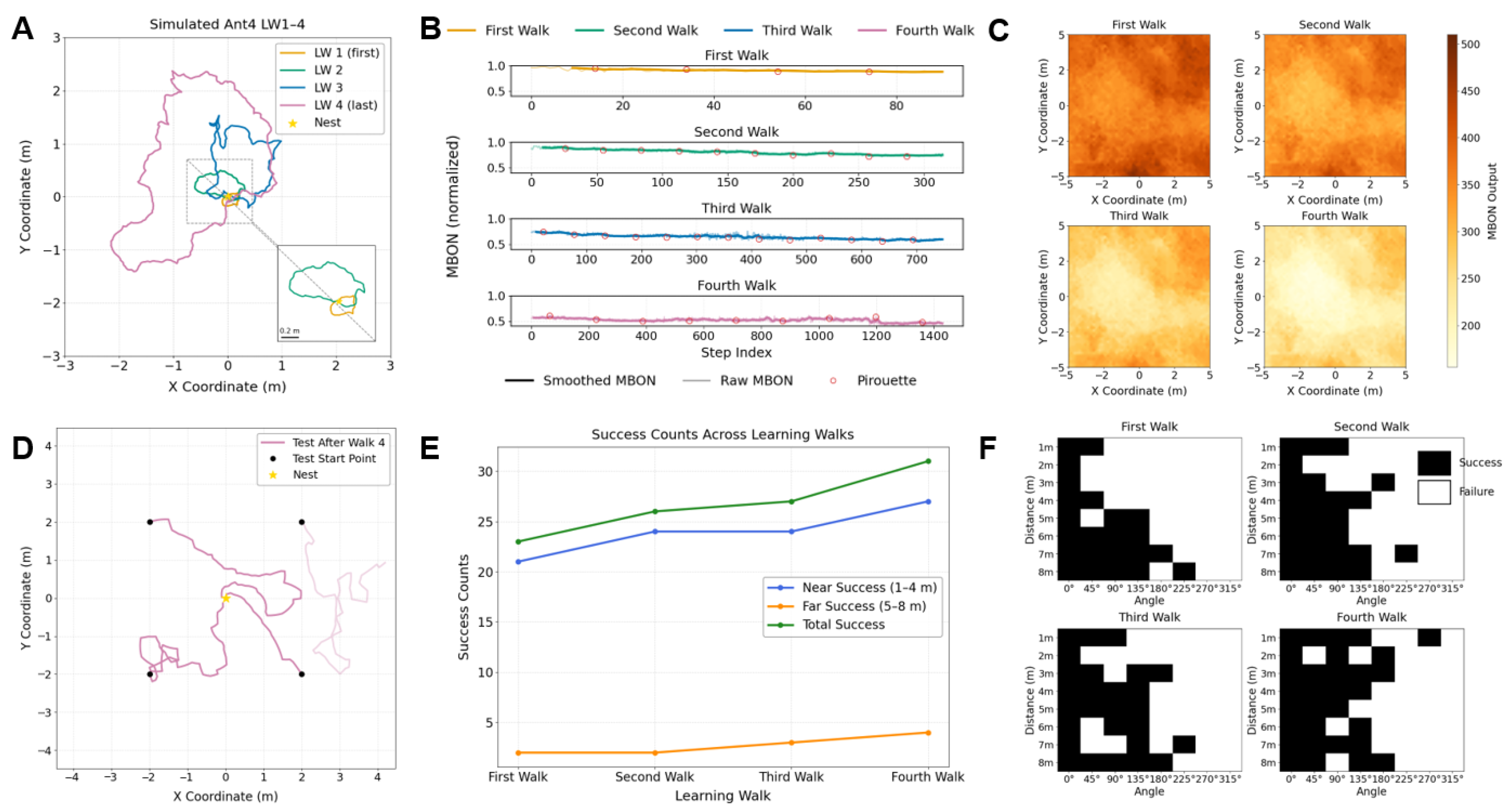 The following supporting information can be downloaded at https://www.mdpi.com/article/10.3390/biomimetics10110736/s1. Figure S1: Trajectory evolution across four learning walks for a representative agent (Ant1); Figure S2: Homing trajectories of the same agent after each sequential learning walk (Walks 1–4); Figure S3: Success count statistics across learning walks; Figure S4: Trajectories of four different agents during their first learning walk under an asymmetric olfactory field; Figures S5–S8: Sequential learning walks (Walks 1–4) of a single agent in an asymmetric olfactory environment, showing the progressive adaptation of its trajectories across learning trials; Figure S9: Spatial configuration and odor concentration distribution of the asymmetric olfactory field; Figure S10: Comparison of average turning angles between ants in the empty environment and those in the normal complex environment; Figure S11: Sampling schematic for agents in the empty environment; Figures S12–S15: Trajectories of a single agent performing four sequential learning walks in the empty environment; Figure S16: Sampling schematic for agents in the normal environment; Figures S17–S20: Trajectories of a single agent performing four sequential learning walks in the normal environment; Figure S21: Homing success rates across all test points and all agents after each of the four learning walks, summarizing navigation performance at different learning stages; Figure S22: Heatmaps of normalized MBON activity within each learning walk area, showing decreased spatial novelty with repeated learning; Figure S23: Statistical comparison of trajectory tortuosity (average turning angle) and number of scans across learning walks; Figures S24–S27: Trajectories of four individual ants during four consecutive learning walks under normal visual conditions; Figures S28–S31: Trajectories of learning walks under reduced visual-learning conditions, showing the impact of limited visual learning; Figure S32: Supplementary statistical analyses of homing test results at middle distances (3–6 m), supporting Figure 5 in the main text; Table S1: Paired t-test statistics of homing success rates across different learning walks for near, middle, and far distances, reporting significance and effect sizes; Text S1: Computational method for constructing the ZM memory used in visual navigation, as described in the Methods section; Dataset S1. Raw homing test results used to generate Table S1, covering all distances and learning stages.