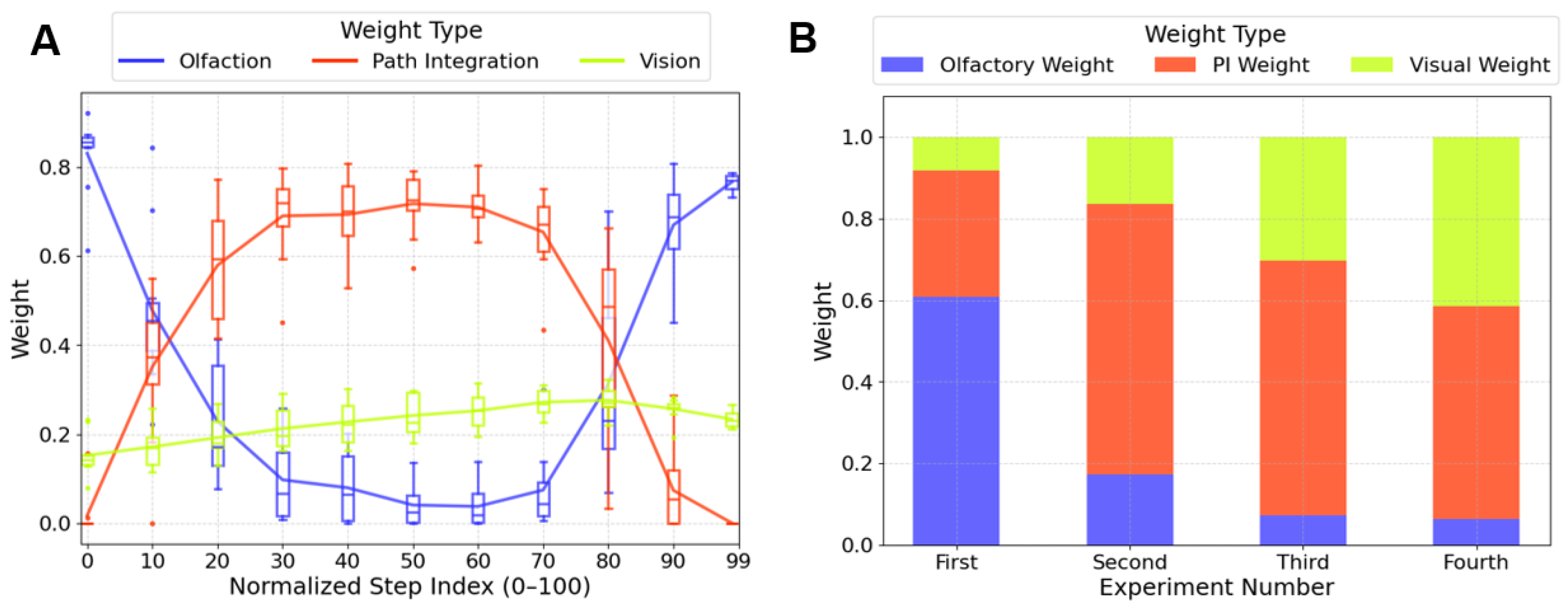 This vector represents the agent’s integrated estimate of the nest direction based on multisensory navigation tools, and serves as the foundational cue for downstream navigation decisions.
