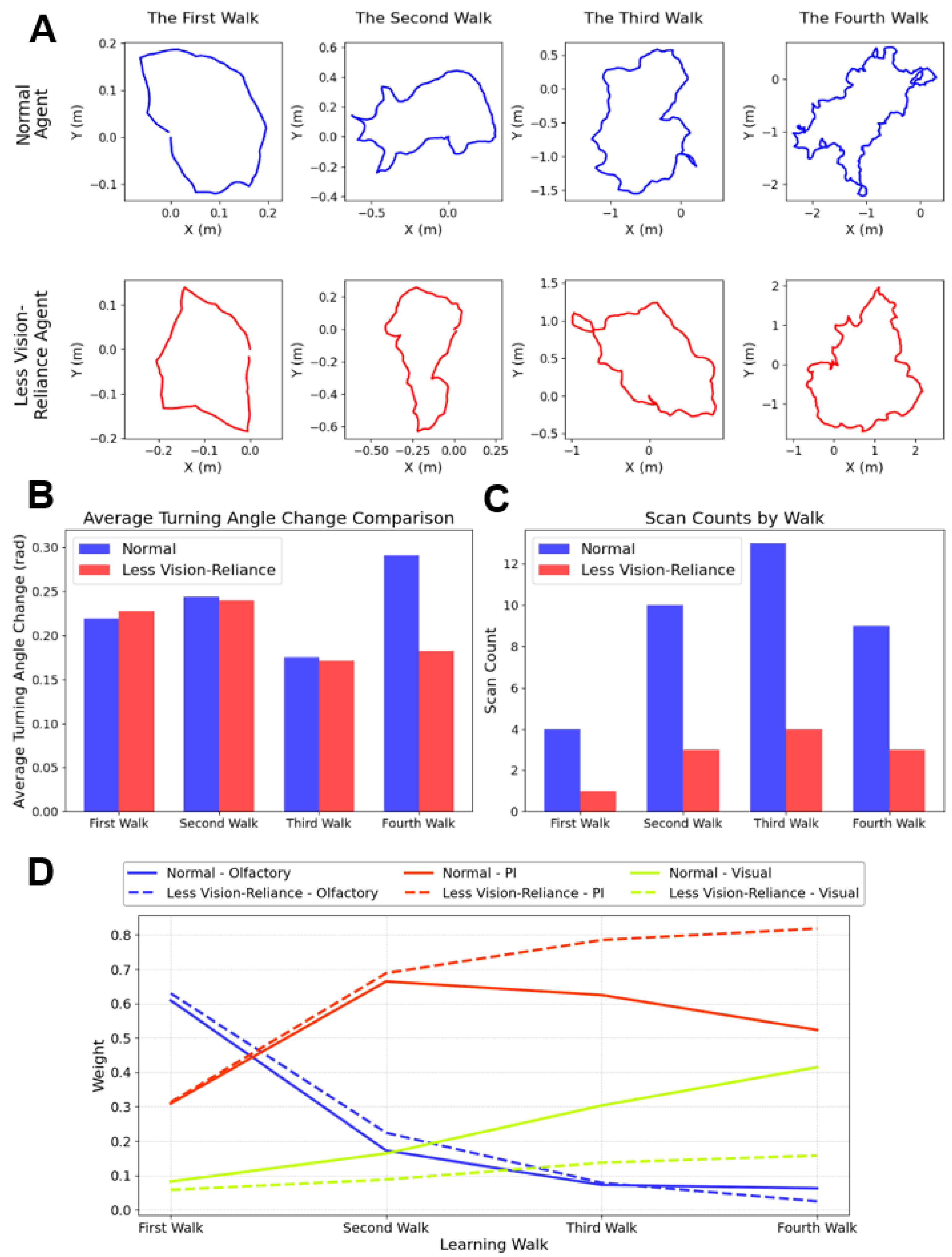 To evaluate the model’s generalisation capacity under altered sensory conditions, we implemented a variant of the agent with reduced reliance on visual input. In this condition, all model components and parameters were kept identical to the baseline setting, except for two targeted modifications: (1) the visual learning rate was reduced from 0.01 to 0.005, and (2) the pirouette scanning frequency was set to one quarter of the default rate. These changes were designed to simulate less vision-reliant individuals, while maintaining the same multiplicative increase in scan counts across learning walks as reported in []. All other strategy weights, memory structures, and network configurations remained unchanged, allowing for a direct comparison with the standard agent configuration.
