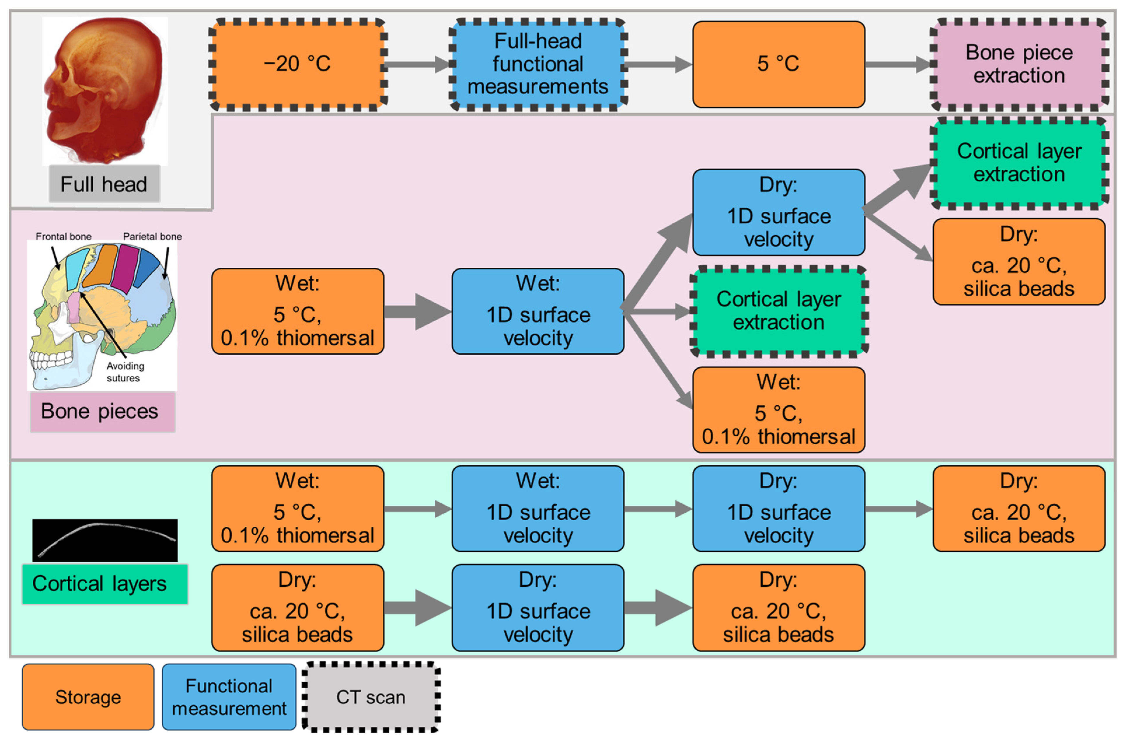 Figure 2. Measurement protocol for the cadaver head, detailing sample handling across hierarchical levels: full head (system), bone pieces (structures), and cortical layers (tissue). No subsystem was investigated in this case. Sample storage steps are marked in orange, and functional measurements are indicated in blue. Sample states documented via CT scanning are outlined with a dashed black contour. The timeline proceeds from top to bottom and from left to right as indicated by arrows. Big arrows correspond to the measurement protocol of the representative bone piece selected to present functional measurements. The skull illustration was adapted from Villarreal (2017) [43].