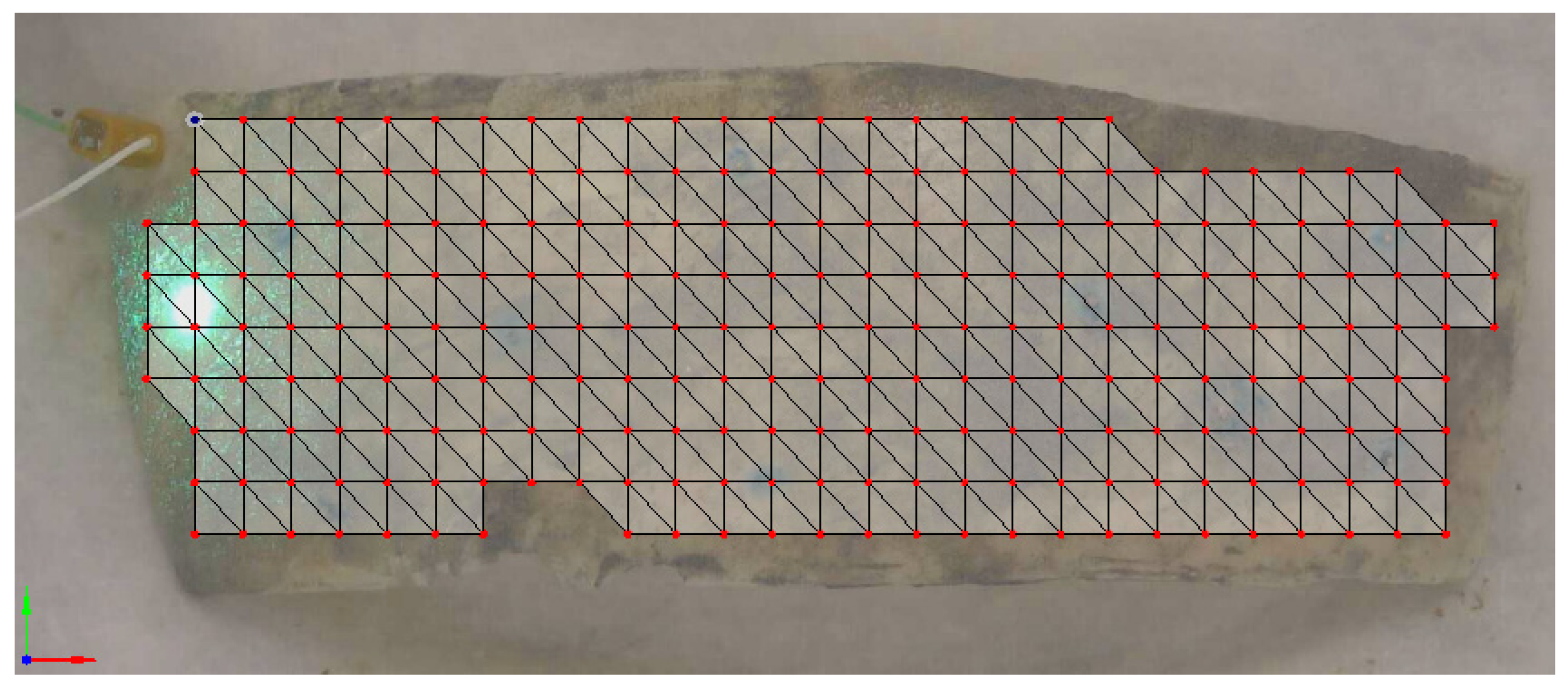 For the representative PMR specimen (Figure 3), the excitation was applied using a chirp signal from 1 Hz to 20 kHz, with responses recorded at a spectral resolution of 12,800 lines and averaged over four measurements per point. Amplification was held constant across all conditions. On the peripheral surface, the bone pieces were measured at 334 points; for the cortical layer, the number of points was reduced to 240 owing to constraints on measurement duration and data volume. Measurement grids overlaid on images of the specimens with the attached PA are provided in Appendix A.